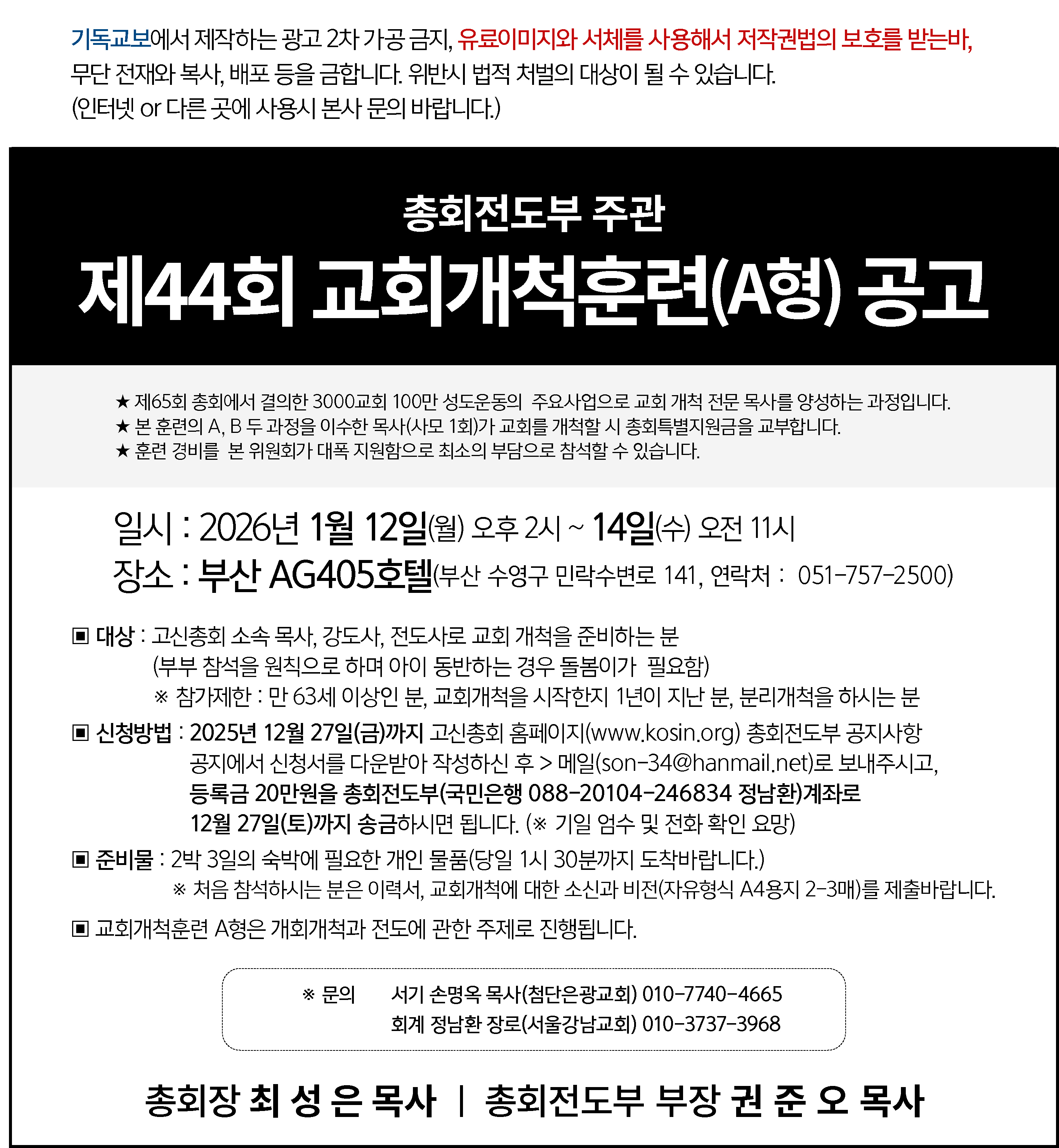 | 49 | 제26회 교회개척훈련원 안내 | 전도부 | 2020.11.04 | 1169 |